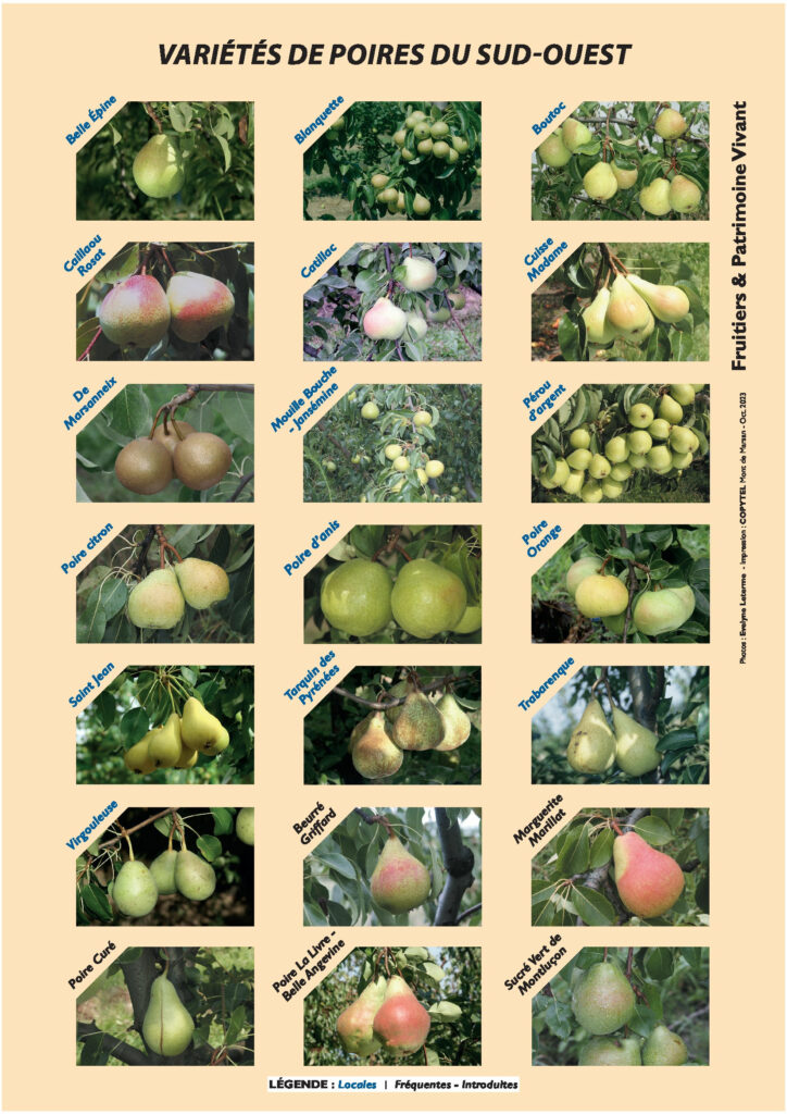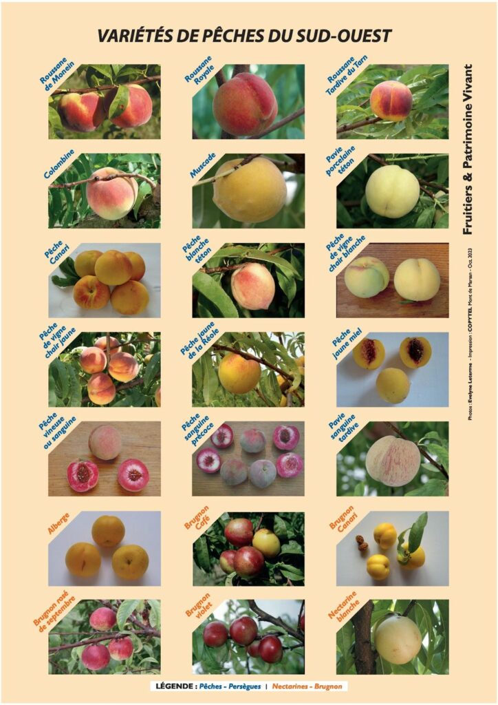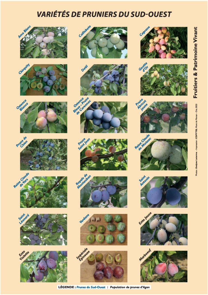 Nous avons choisi de regrouper sur ces 7 panneaux quelques-une des variétés locales que nous avons collectées dans les campagnes du Sud-Ouest à la fin du 20e siècle, variétés paysannes ou introduites. Les analyses moléculaires nous ont confirmé que ces variétés paysannes sont bien issues du Sud-Ouest et étaient à cette époque majoritairement inconnues ailleurs. Certaines devenues rares, avaient été bien plus fréquentes auparavant. Quant aux variétés introduites d’origine nationale ou européenne, elles avaient trouvé une place importante dans les campagnes. On constate à l’heure actuelle que l’activité de diffusion du Conservatoire Végétal Régional d’Aquitaine par sa pépinière (créée dès 1988 au sein de l’Écomusée de la Grande Lande) et repris par de nombreux jeunes pépiniéristes, leur a permis d’être implantées bien au delà de leur zone de création. C’est donc en quelque sorte un échantillon du patrimoine fruitier local que l’on vous propose de découvrir à travers 63 variétés de pommes, 21 de cerises, 21 de pêches, 21 de poires et 21 de prunes.
