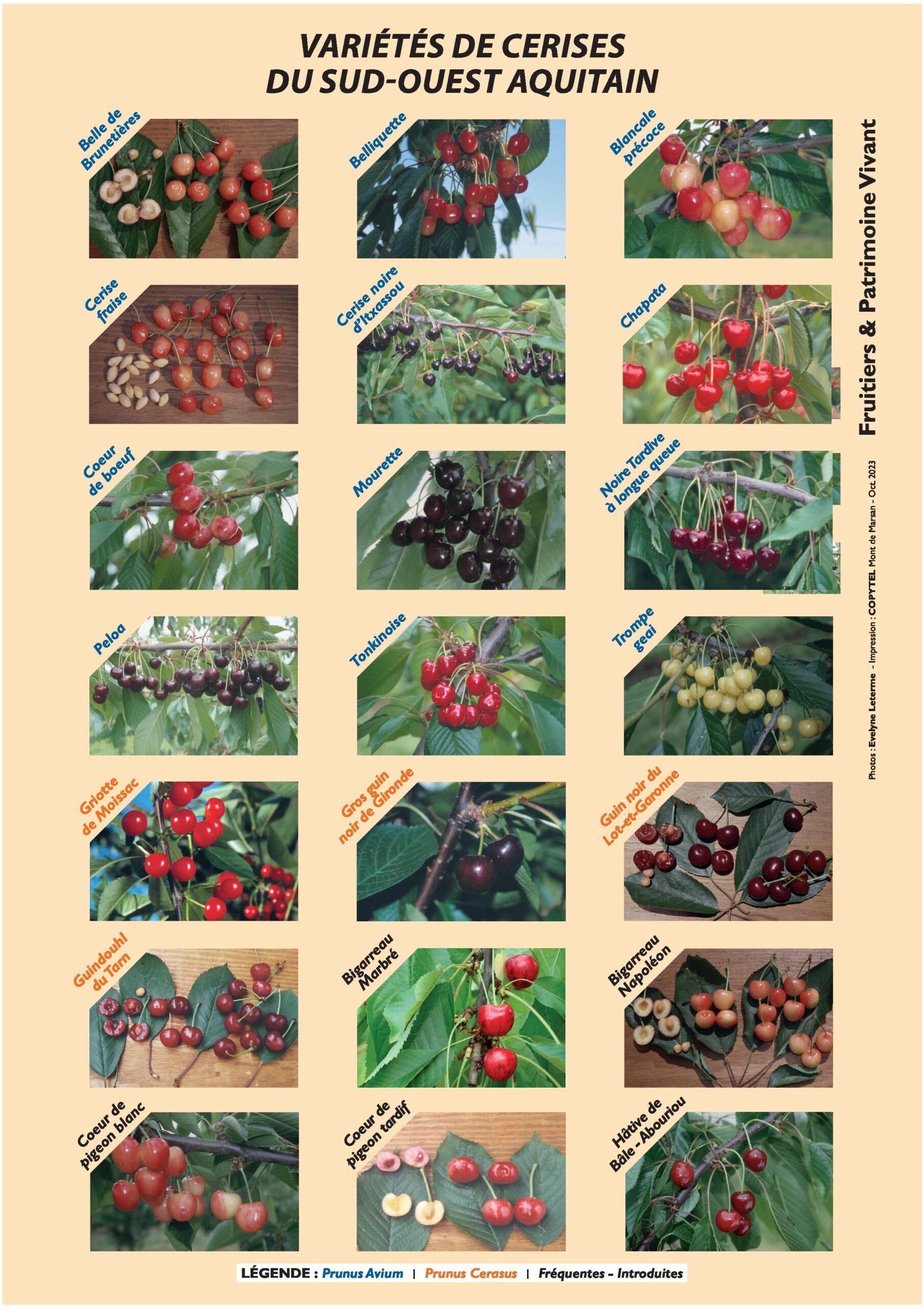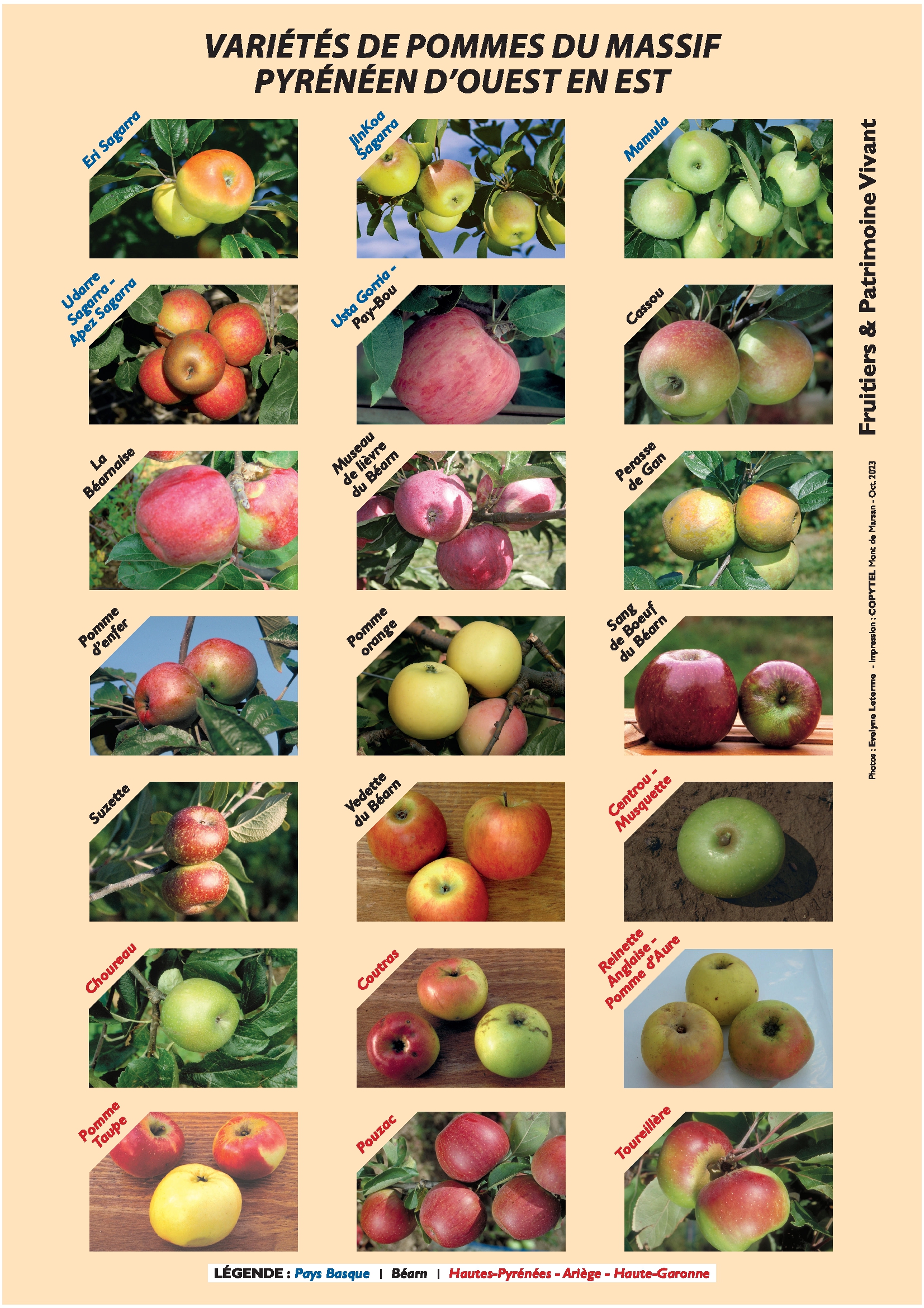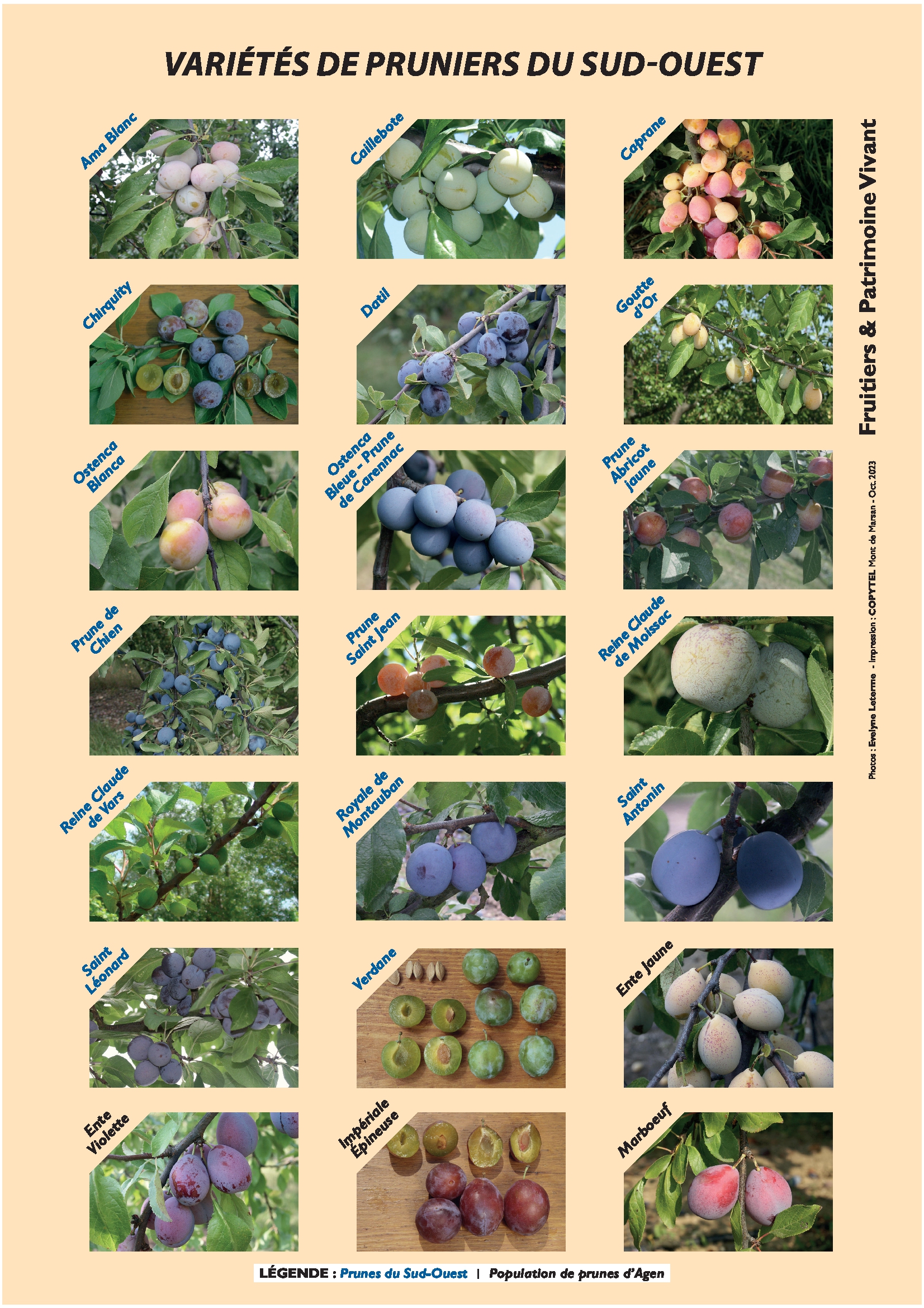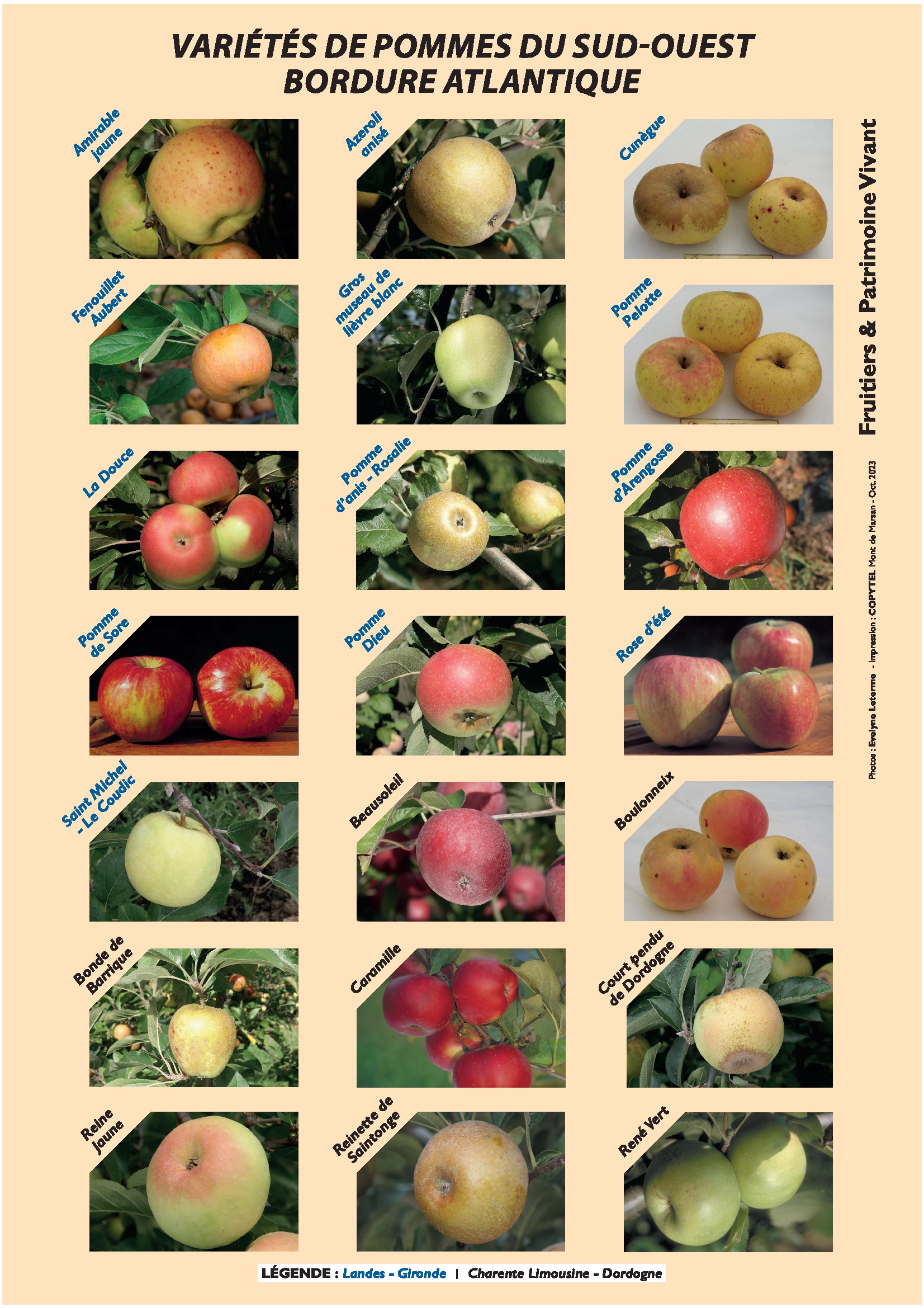 Nous avons choisi de regrouper sur ces 7 panneaux quelques-une des variétés locales que nous avons collectées dans les campagnes du Sud-Ouest à la fin du 20e siècle, variétés paysannes ou introduites. Les analyses moléculaires nous ont confirmé que ces variétés paysannes sont bien issues du Sud-Ouest et étaient à cette époque majoritairement inconnues ailleurs. Certaines devenues rares, avaient été bien plus fréquentes auparavant. Quant aux variétés introduites d’origine nationale ou européenne, elles avaient trouvé une place importante dans les campagnes. On constate à l’heure actuelle que l’activité de diffusion du Conservatoire Végétal Régional d’Aquitaine par sa pépinière (créée dès 1988 au sein de l’Écomusée de la Grande Lande) et repris par de nombreux jeunes pépiniéristes, leur a permis d’être implantées bien au delà de leur zone de création. C’est donc en quelque sorte un échantillon du patrimoine fruitier local que l’on vous propose de découvrir à travers 63 variétés de pommes, 21 de cerises, 21 de pêches, 21 de poires et 21 de prunes.